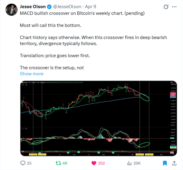 A bullish MACD crossover just fired on Bitcoin's weekly chart. Most people will call this the bottom. Chart history says otherwise. When this crossover fires in deep bearish territory, divergence typically follows. Translation: price goes lower first. The crossover is the setup, not the signal. Wait for confirmation.